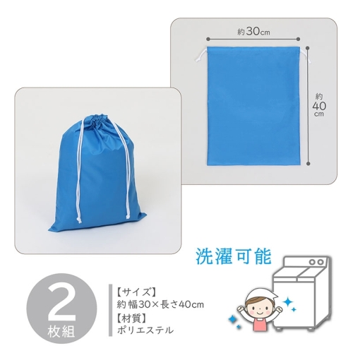 【商品仕様】サイズ/約幅30×長さ40cm、カラー/ブルー、内容/2枚、材質/ポリエステル【持ち運びに便利な巾着】シューズ入れや着替え入れ、バスタオル入れなどとして使える巾着。【洗濯機で洗えて衛生的】シワになりにくいポリエステル製。汚れても洗濯機で洗えて衛生的。【ジムや旅行へ行く際に】ジムやレッスン、出張、旅行、アウトドアの際のパッキングで活躍。【使い分けできる二枚組】2枚セットで使い分けできる。